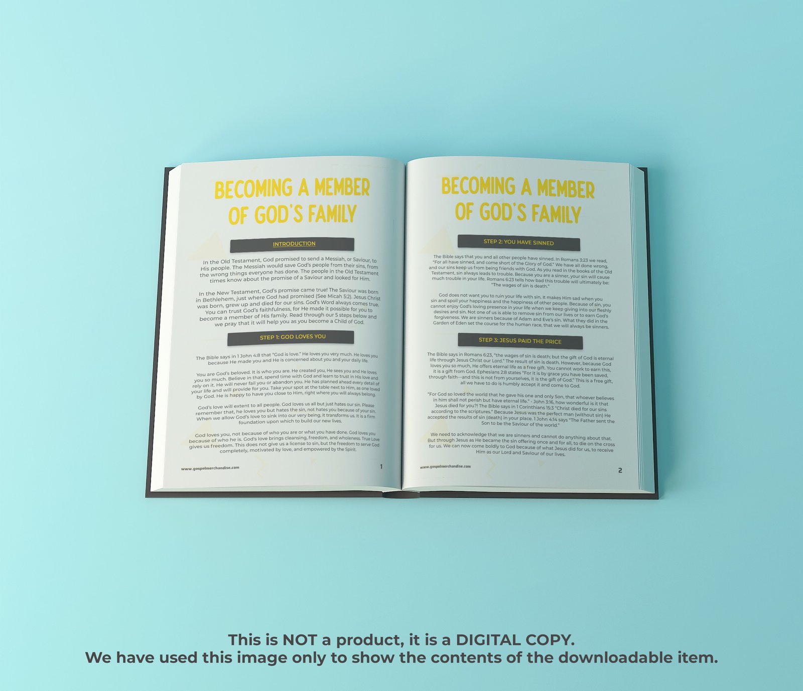 This is a FREE PDF Document about ‘Becoming a Child of God’ which has a total of 4 pages. This includes key scriptures and gives you guidance on knowing Jesus personally. You can download this as much as you like and share with others! I pray that this document will help you and others as you share this. PLEASE NOTE: This is a DIGITAL VERSION and not a printed version that you receive (Images are just for showcasing the content), but you can print this out yourselves.