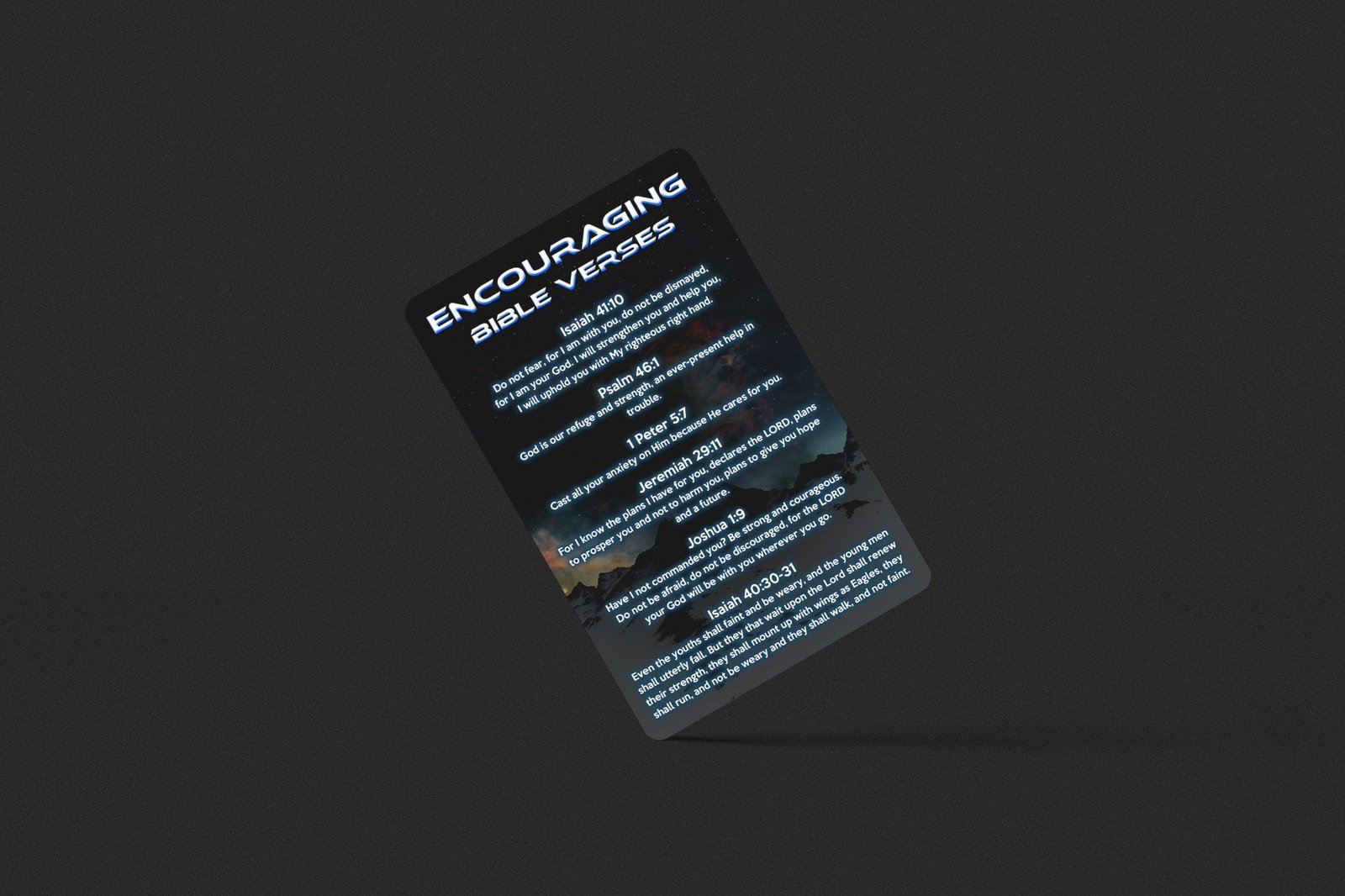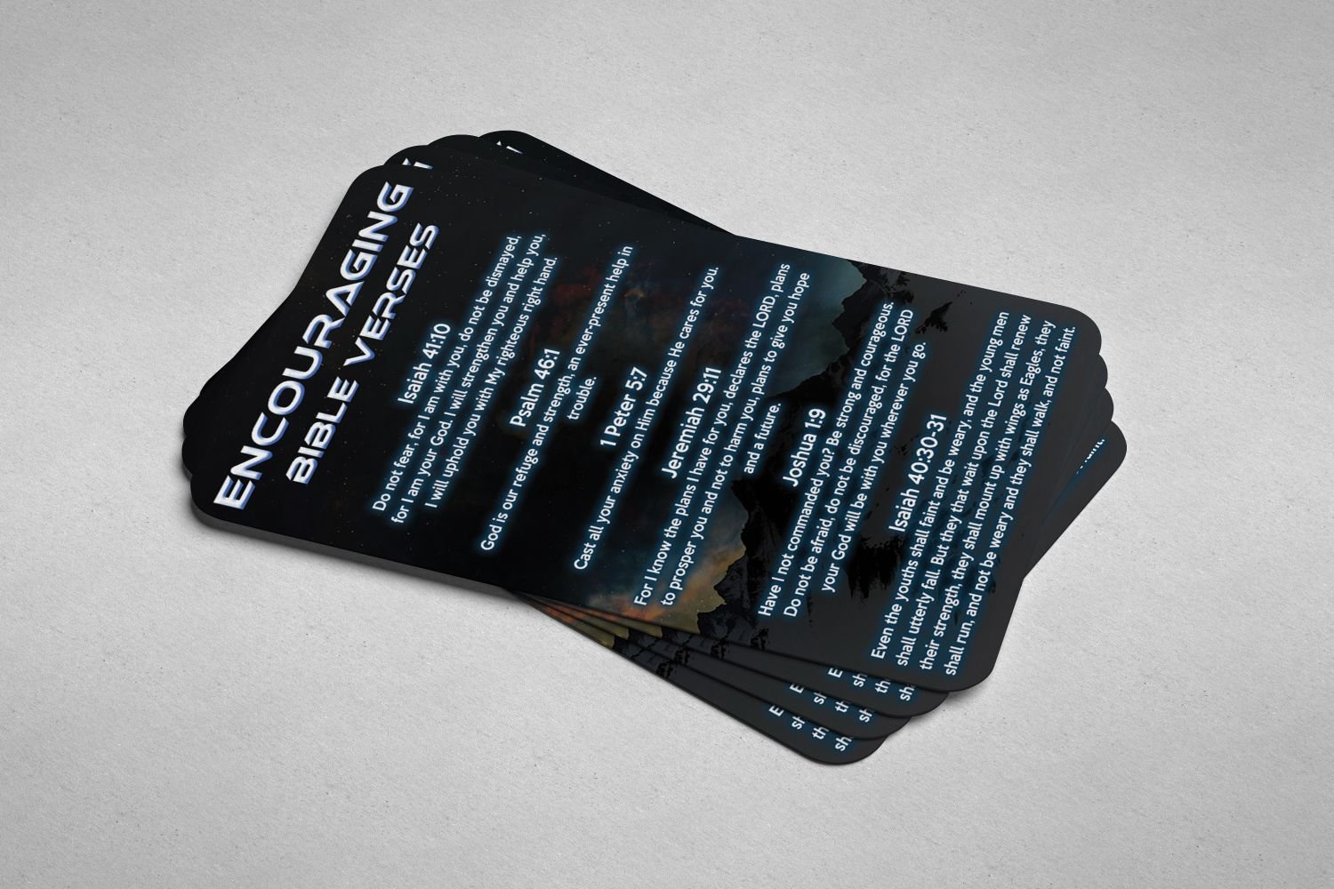 Similar to the other Bible Cards, this however, is purely hand picked Bible verses that can give you that extra comfort or push needed for the day! The Encouraging Bible Verses card is an important factor that we can carry and take with us wherever we go. There are soo many Bible verses that you can choose from, but these verses however do stand out for majority of the situations we may face.
